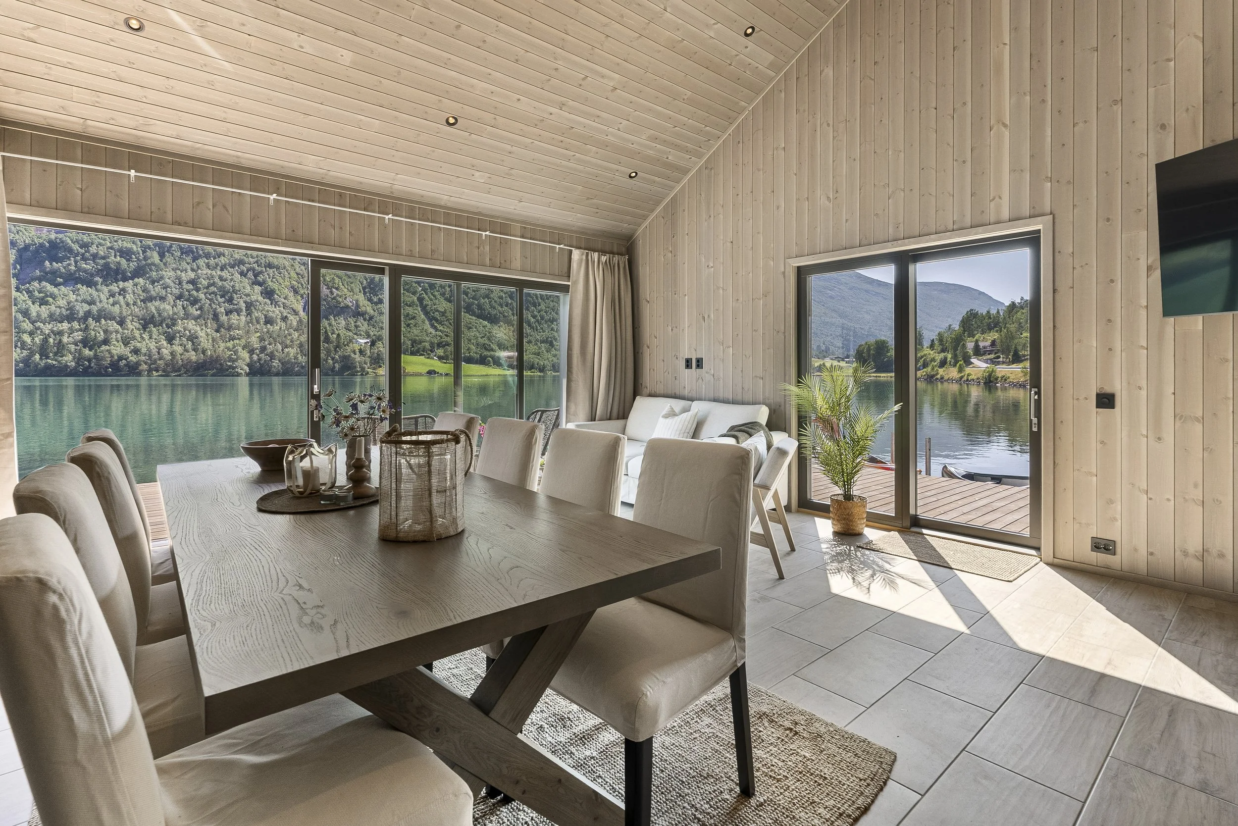 Store vindu og skyvedører plasserer deg midt i naturen og i eitt med det irrgrøne vatnet. Når kroppen kokar av varme, kan du frå badebrygga kaste deg ut i eit forfriskande bad. Dei store terrassene rundt naustet har gode sitjegrupper og legg til rette for å nyte vesten!